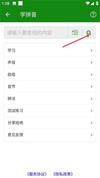 1、進(jìn)入【學(xué)拼音】頁面后,點(diǎn)擊搜索欄右側(cè)的【搜索】按鈕,可快速進(jìn)入【查找內(nèi)容】頁面,精準(zhǔn)定位所需學(xué)習(xí)內(nèi)容。
